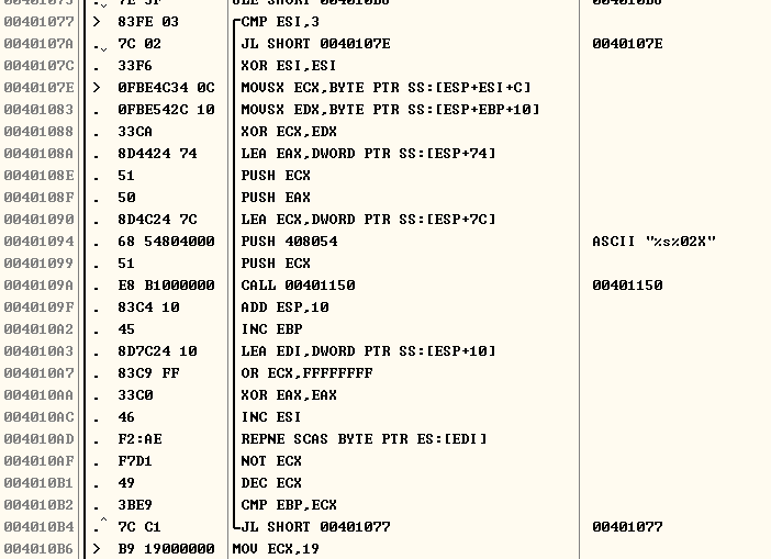 name을 hello로 해주고 디버깅을 해줬는데 401150은 시리얼 넘버를 넣는 함수같고 40107E와 401083의 MOVSX를 자세히 보면은 ecx와 edx에다가 값을 또 넣어주고 있다 그래서 이 값을 디버깅하면서 살펴봤다.