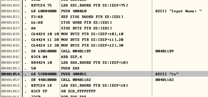 대충 4011B9함수에서 input name 문자를 프린트하고 4011a2함수에서 scanf로 name을 받는듯 했다. 밑에 시리얼 넘버도 똑같이 작동했다.