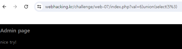 $result=mysqli_query($db,"select lv from chall7 where lv=($go)") or die("nice try!");