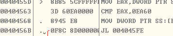 eax가 0ea60보다 작을 때 jl 이 작동한다. 그래서 cmp와 jl부분에 bp를 걸어보고 실행해보면은
