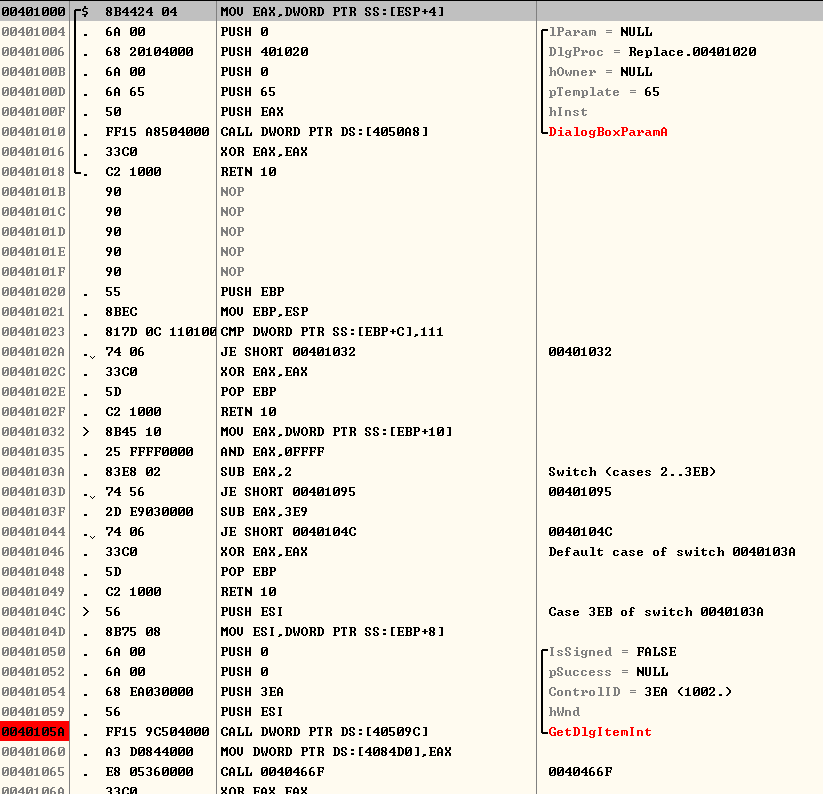 그냥 디버깅하면 DialogBoxParamA를 불러오고 바로 40466F로 가지니 GetDlgItemInt부분에 BP를 설정하고 하나씩 가보겠다.