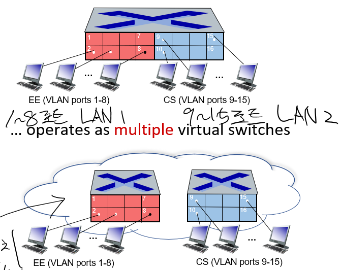 - 자신의 포트들끼리만 프레임을 전송할 수 있는데 1~8번 포트는 1~8번포트끼리만 broadcast 메시지를 받는다.