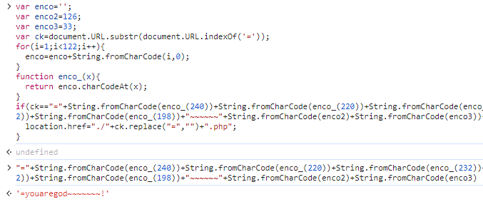 if(ck=="="+String.fromCharCode(enco_(240))+String.fromCharCode(enco_(220))+String.fromCharCode(enco_(232))+String.fromCharCode(enco_(192))+String.fromCharCode(enco_(226))+String.fromCharCode(enco_(200))+String.fromCharCode(enco_(204))+String.fromCharCode(enco_(222-2))+String.fromCharCode(enco_(198))+"~~~~~~"+String.fromCharCode(enco2)+String.fromCharCode(enco3)){