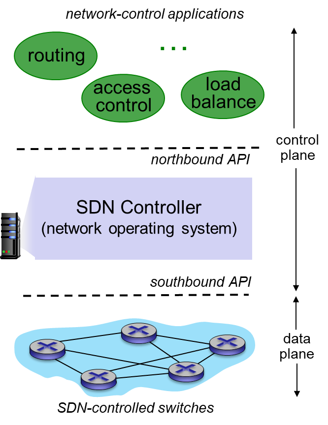 - Per router는 각각의 routing algorithm에 의해 forwarding table을 갖고있떤 반면 SDN은 컴퓨터가 중앙 통제한다.
