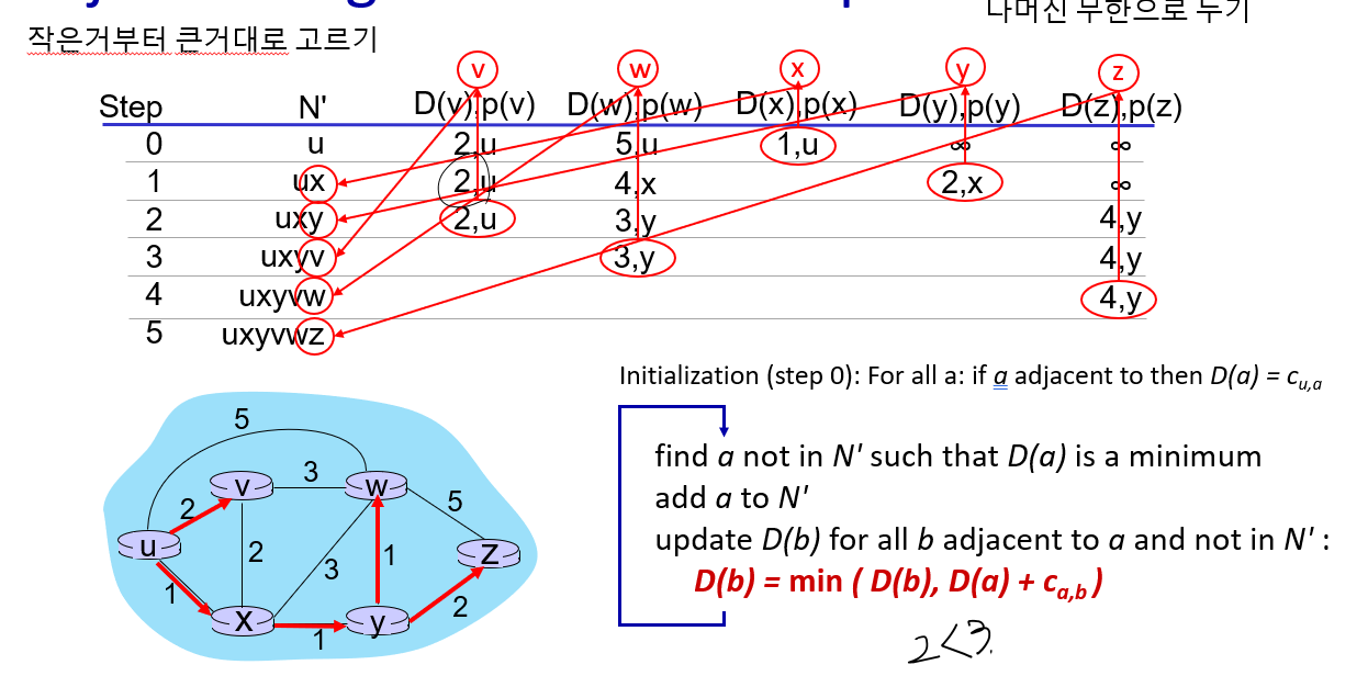 - 각 라우터는 다익스트라 알고리즘 통해서 모든 정보 알고있음