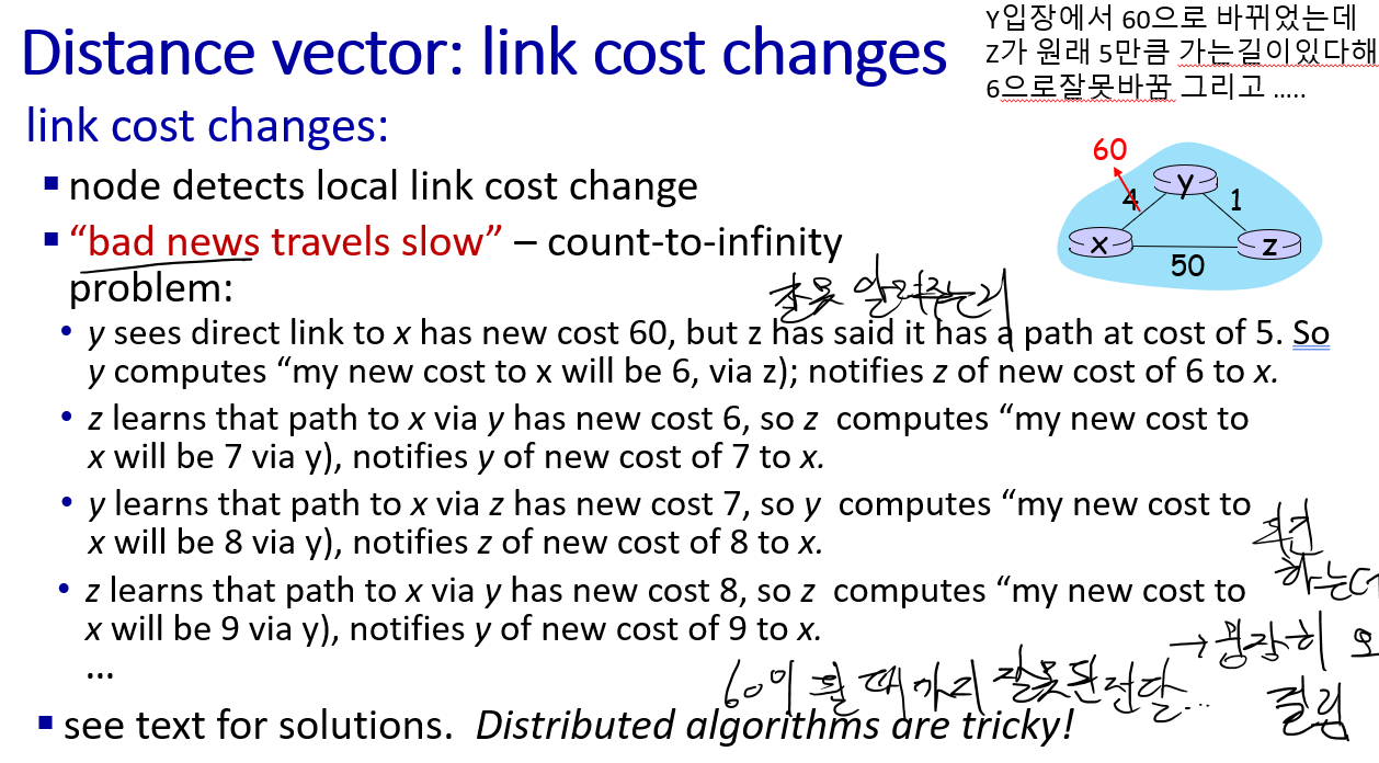 - 만약 이웃으로부터 새로운 distance vector를 받았다면 계산을 통해 자신만의 테이블을 업데이트한다.