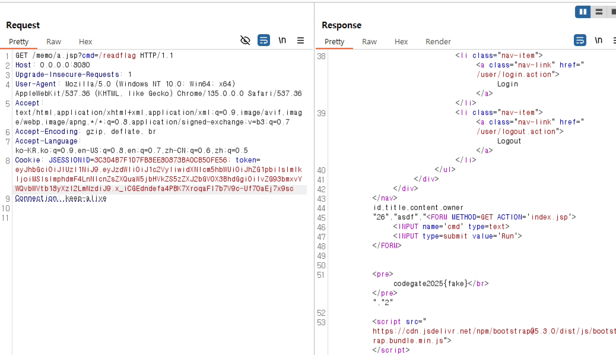 요 jwt토큰을 사용하여 /memo 경로에 아무 더미 jsp경로를 불러오면 RCE가 가능하다.