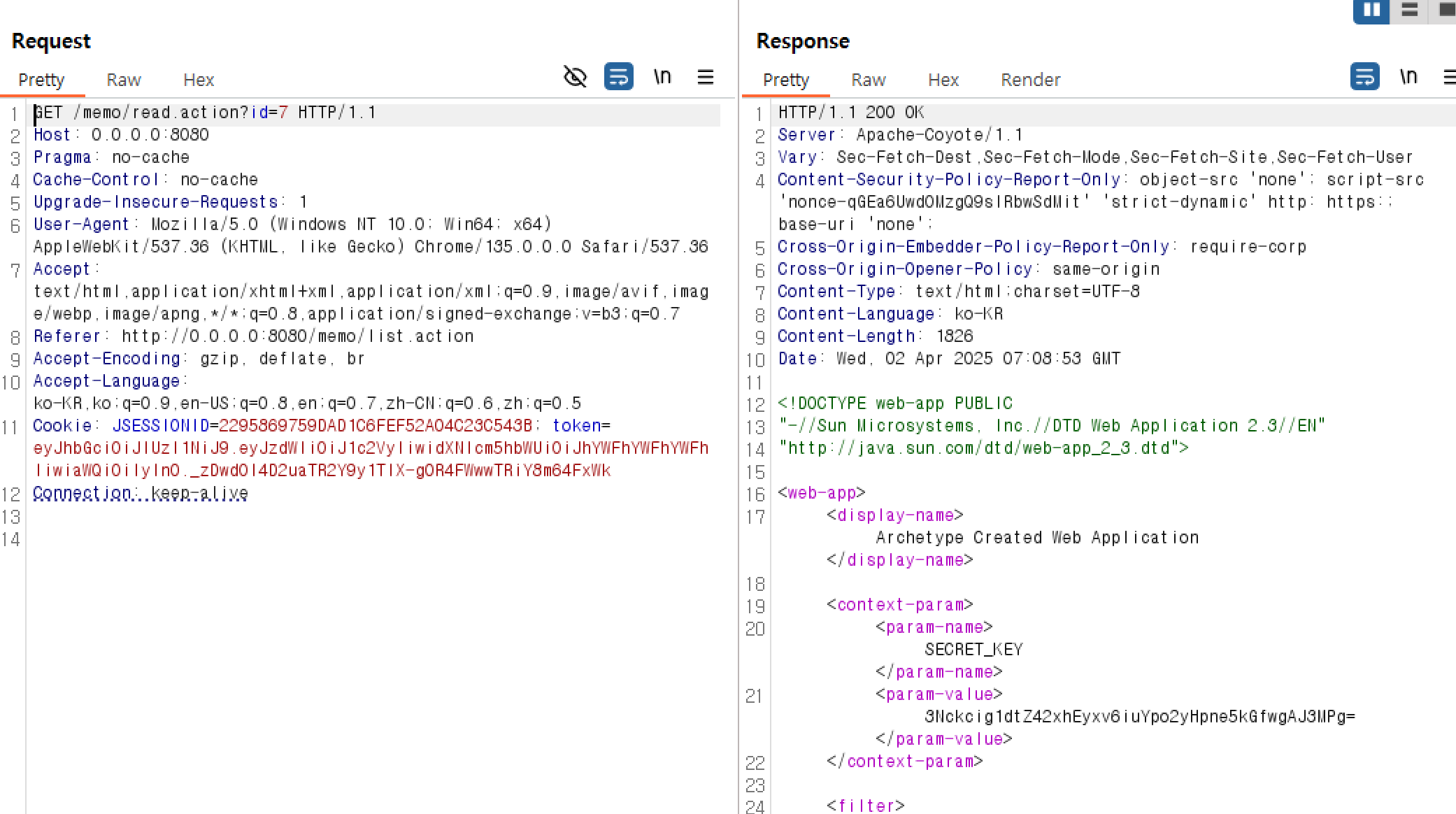 심지어 MemoAction.java코드에서 setServletRequest를 통해 request를 저장하고 있기에 /memo 경로에서 해당 취약점이 터질 것이다.