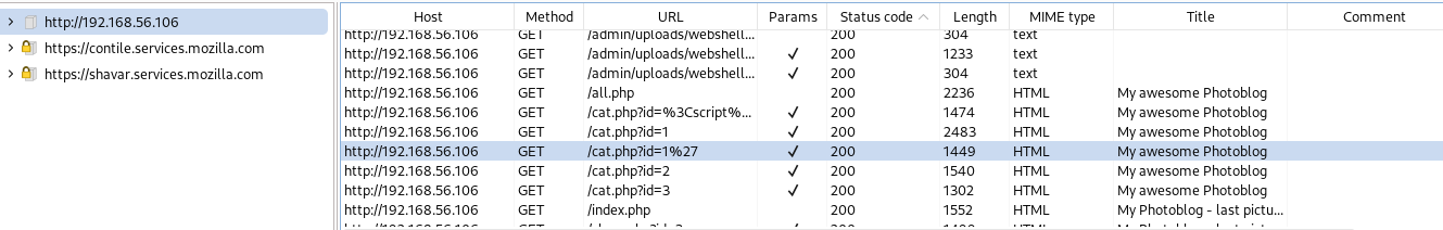 웹 사이트의 여러 페이지를 볼 수 있는데 이 중 /cat.php?id=1인 곳을 먼저 확인해줬다.